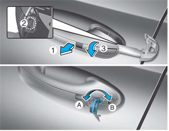 2. 손잡이를 당긴 상태에서 비상 키로 손잡이 안쪽에 있는 후크를 눌러 커버를 빼십시오.